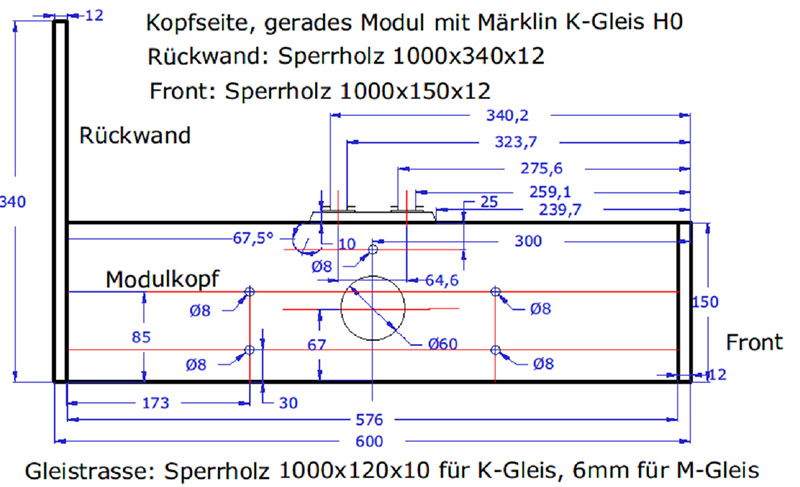 Die Module erfordern bestimmte Normen als Vorgabe, damit sie untereinander frei kombinierbar sind. Wir arbeiten mit dem K-Gleis von Märklin - es kann aber auch das C-Gleis (nach Anpassung) genutzt werden. Die geraden Module haben ein Maß von 1000 mm x 600 mm und eine Bauhöhe von 150 mm. Die Kopfstücke erhalten nach Plan verschiedene Bohrungen zur Verschraubung und zur Durchführung eines Kabelbaumes. Das Gleisbrett für den Bahndamm ist für das K-Gleis 10 mm hoch, 120 mm breit und wird mittig auf den Kopfstücken befestigt. Aus der Geometrie des K-Gleises ist der Gleisabstand der beiden Gleisstränge an den Kopfstücken mit 64,6 mm festgelegt. Bei Verwendung des C-Gleises muss das Gleisbrett entsprechend niedriger gelegt werden. Baut eine Gruppe mehrere Module kann der Gleisverlauf zwischen Anfang und Ende variiert werden. Die Module müssen dann aber stets zusammen aufgebaut werden. Der Kabelbaum unter dem Modul besitzt 6 Adern mit 1,5 mm² Querschnitt und wird mit steckbaren Lüsterklemmen mit 2,5 mm² bestückt. Unter dem Modul findet eine Aufteilung des Kabelbaumes über 5-polige Wago-Klemmen statt, die Kabelverbindungen unterschiedlicher Dicke aufnehmen können. Ein Schienenstrang des Gleises wird als Rückmeldekontakt genutzt. Das C-Gleis muss dafür etwas vorbereitet werden.